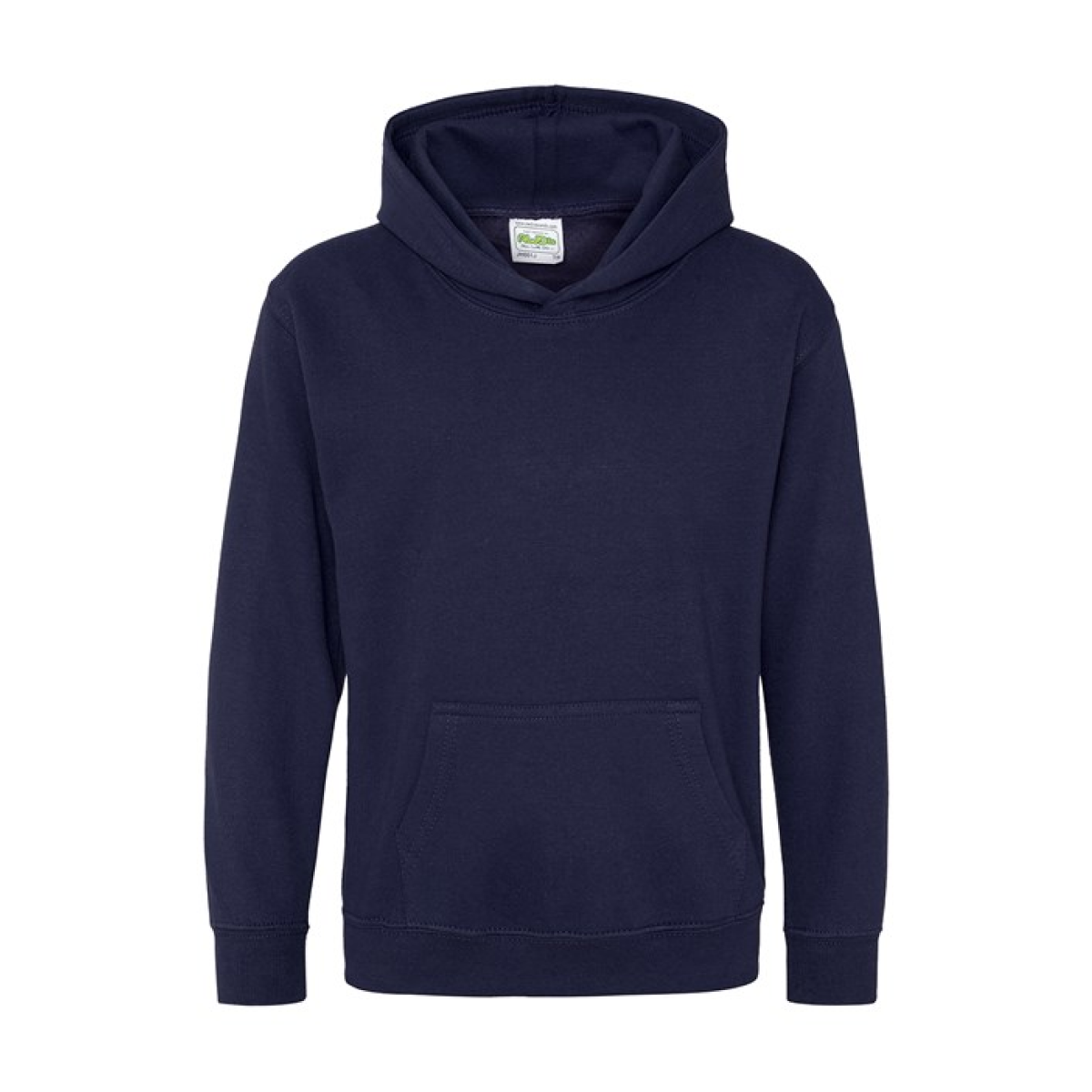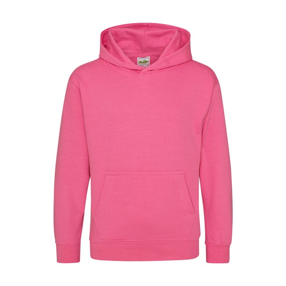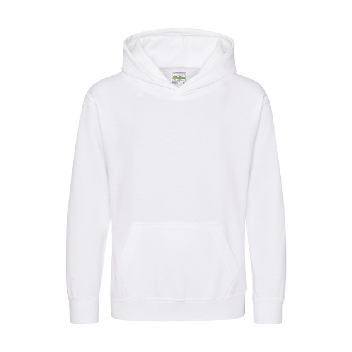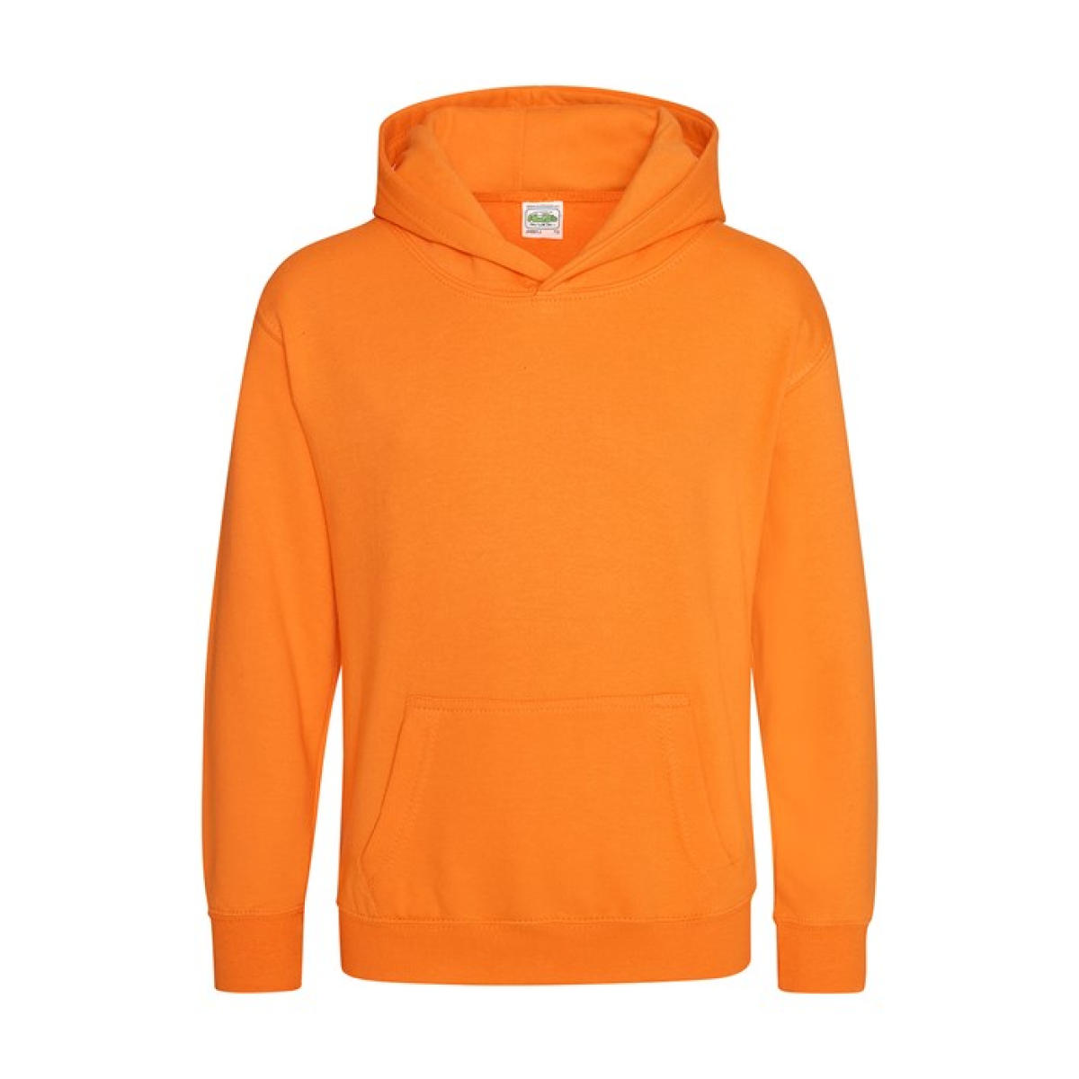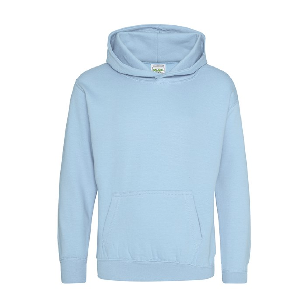 Single Jersey back neck tape for comfort. Double fabric hood without drawcord, in line with European childrenswear legislation. Front pouch pocket. WRAP certified.