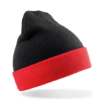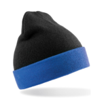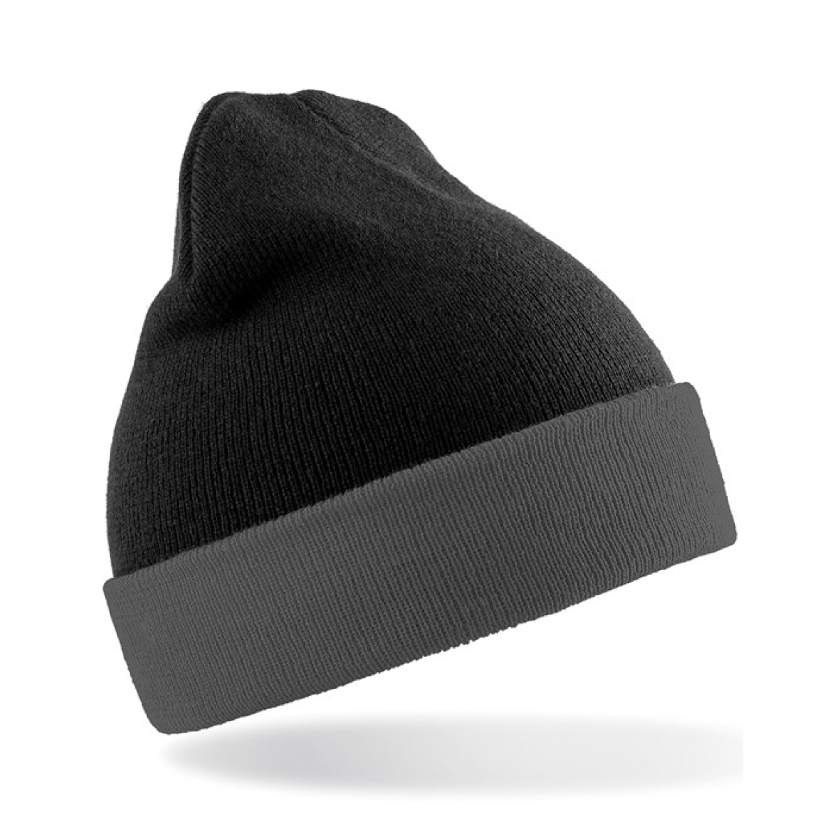 Beanie made from 50% recycled materials. Contrast colour deep cuff. Double thickness. Full size style. Soft-feel knit. .
